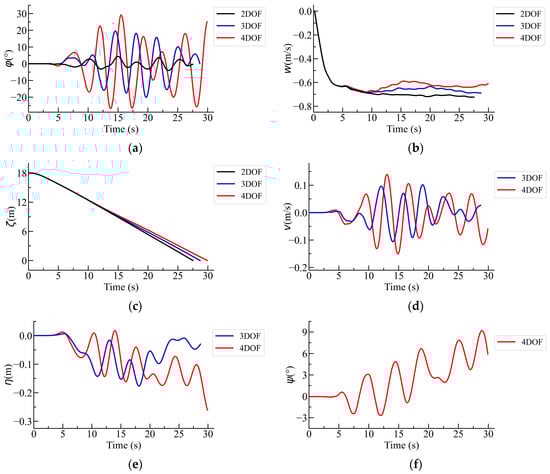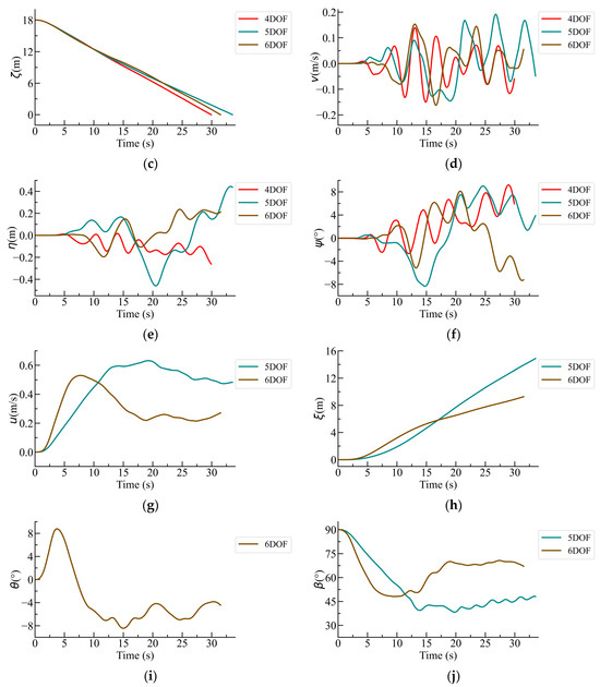 When all the DOF in the horizontal plane of the submarine is released, the comparison of different DOF in the vertical plane impacts the horizontal forces and rolling, while the change of DOF in the vertical plane primarily affects the vertical hydrodynamic angle of attack β of the submarine, as expressed in Equation (7). Figure 12 presents a comparative plot of the calculation results for three ascent scenarios of the second group. Figure 12a–j illustrate the time history curves for roll angle φ, vertical velocity w, vertical displacement ζ, lateral velocity v, lateral displacement η, yaw angle ψ, longitudinal velocity u, longitudinal displacement ξ, pitch angle θ, and vertical hydrodynamic angle of attack β. The angle β is given by