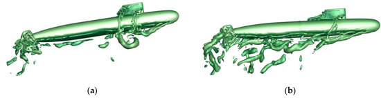 Figure 13 depicts the vortex quantities around the submarine hull at various instants during the 6DOF free ascent motion. In the early stages of motion, when the submarine speed w is low, the vortex quantities around the hull are not prominent, with only a small number of vortices present near the casing and rudder. The hull is in a “bow-up” posture. As the speed w increases, the flow field around the hull gradually becomes more intricate, with significant growth in vortex quantities. Moreover, the hull posture transitions from “bow up” to “bow down,” which is accompanied by asymmetry in the left and right vortices of the hull. Consequently, the hull motion becomes progressively intricate.
