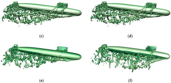 Vortex quantities and attitude diagram of the submarine at different instants during deep free ascent motion. (a) t = 4 s; (b) t = 6 s; (c) t = 10 s; (d) t = 12 s; (e) t = 14 s; (f) t = 16 s.