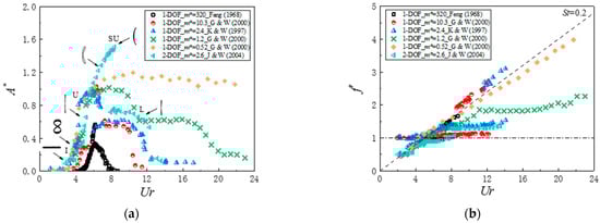 Comparison of the cross-flow vibration response versus reduced velocity for an elastically mounted rigid cylinder with various mass ratios [13,15,16,17]: (a) non-dimensional vibration amplitude; (b) non-dimensional vibration frequency.