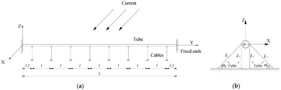 As shown in Figure 2a,b, the left end is defined as the origin, and the axial line of the tube is defined as the Y-axis. The coordinates of an anchored SFT can then be determined by the right-hand rule. Perpendicular to the tube, the direction of incident currents is defined as the X-axis. The vertical up is defined as the Z-axis.
