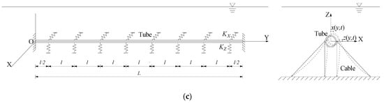 Ignoring the flow–cable interaction, the anchoring cables can be simplified as elastic supports with linear equivalent stiffness in the X- or Z-axis. Thus, the anchored SFT can be considered a mass-spring-damping system, as shown in Figure 2c [26]. Spacing among the on-way anchors is the same, and the material properties of symmetrical anchors are the same. Based on the slicing method, the vibration of an SFT under current can be simplified as two-degree-of-freedom vibration in the plane, and the governing equations [21,22,23] can be expressed in Equation (1):