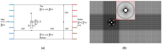 As shown in Figure 3a, the numerical model consists of a 50D × 30D rectangular computational domain and an elastically mounted circular cylinder. For coordinates, the X- and Z-axis are defined as in-line and cross-flow direction, respectively. For the computational domain, the initial condition is that the SFT and fluid are stationary. The inlet boundary is 15D upstream from the center of the cylinder, and the Dirichlet boundary condition is imposed on it. Turbulence is defined by the turbulence intensity () and hydraulic diameter. The outlet boundary is 35D downstream from the center of the cylinder, and the Neumann boundary is set. The top and bottom boundaries are 15D away from the center of the cylinder, and the free-slip boundary is employed. The no-slip boundary is applied on the surface of the cylinder.