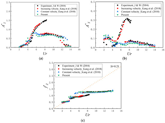 Figure 4c shows the comparisons of the results of cross-flow vibration frequency versus reduced velocity. It shows that the vibration frequency also agrees well with that of Kang et al. (2018) [21]. The average deviation of vibration frequency in the cross-flow direction is 3%, and the maximum deviation is 9% (at = 4).