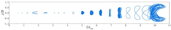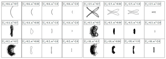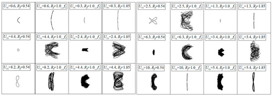 Figure 6 shows the XZ-trajectories of the SFT versus reduced velocity. It should be noted that the smaller two-degree-of-freedom responses at ≤ 1.8 are amplified by 10 times synchronously. It reveals that the variation in shape and moving direction for the XZ-trajectory critically affects the vibration of the SFT (i.e., amplitude, frequency, and phase) and wake pattern. Typical “8”-shaped trajectories are present under most reduced velocities corresponding to the 2:1 in-line to cross-flow dominant frequency ratios. For 0.6 ≤ ≤ 1.8, since the phase difference between the in-line and cross-flow vibration is close to 270°, the XZ-trajectories bend downstream and appear like a circular arc (“C” shape). The two-degree-of-freedom vibration amplitudes of the SFT are identical. Due to the one-frequency dominant vibration of the SFT, the XZ-trajectories are periodic and regular. For = 2.5, since the in-line vibration frequency is close to the natural frequency (as shown in Figure 5b), the XZ-trajectory becomes flat. For 3.1 ≤ ≤ 3.8, the XZ-trajectories bend upstream, and the phase difference is close to 90°. For = 4.4, the XZ-trajectory changes to an enclosed loop shape (i.e., the in-line vibration frequency is the same as that in cross-flow). With the further increase in reduced velocity, the cross-flow amplitude of the SFT increases and is larger than the in-line. Due to the in-line multi-frequency vibration, the XZ-trajectories become chaotic and do not repeat the same path from cycle to cycle (even drift from one mode to another). For = 8.2, the XZ-trajectory restores to the standard “8” shape. For = 10, the trajectory becomes irregular again since the multi-frequency vibration is in the in-line direction.