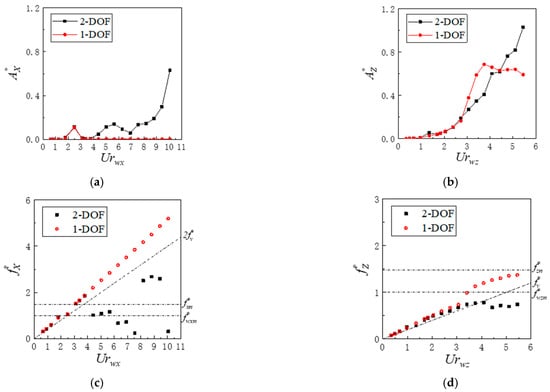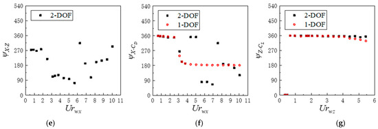 Comparison of the one- and two-degree-of-freedom vibration response of SFT versus reduced velocity (m* = 0.84, Rf = 0.54): (a) in-line vibration amplitude; (b) cross-flow vibration amplitude; (c) in-line vibration frequency; (d) cross-flow vibration frequency; (e) X–Z phase difference; (f) X–CD phase difference; (g) Z–CL phase difference.