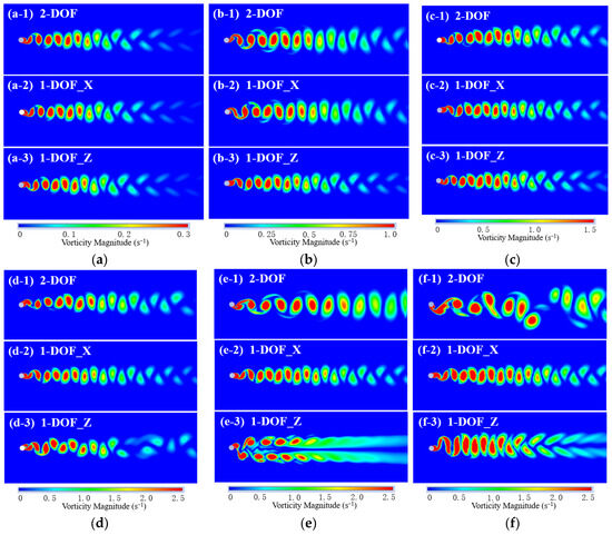 Comparison of the contours of transient vorticity magnitude for SFT under various natural frequency ratios (m* = 0.84): (a) Urwx = 0.6; (b) Urwx = 2.5; (c) Urwx = 4.4; (d) Urwx = 6.3; (e) Urwx = 8.2 (f) Urwx = 10.