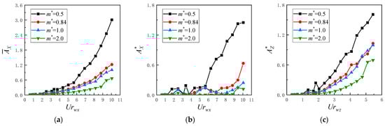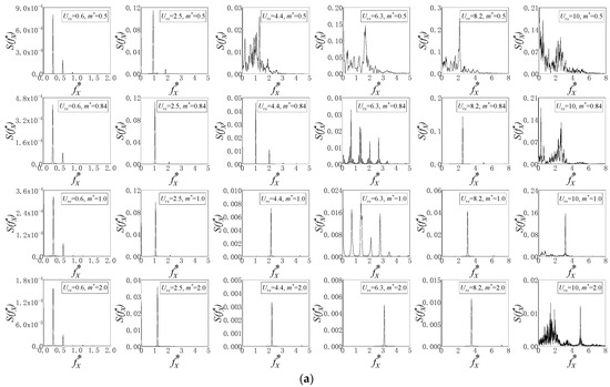 Figure 9 shows the comparison of the XZ-trajectories of SFTs with various mass ratios at typical reduced velocities. Figure 10 shows the spectra of in-line and cross-flow displacements under the same conditions. Comparisons show that the two-degree-of-freedom vibrations of the SFT are significantly suppressed with the increase in mass ratio at ≥ 4.4, especially for the in-line vibration. Due to the in-line multi-frequency effect at larger velocities, the XZ-trajectories become regular and periodic for the SFT with a larger mass ratio. Furthermore, due to the variations in vibration frequency and phase, the pattern of XZ-trajectories and the width of the spectra also vary with mass ratio.