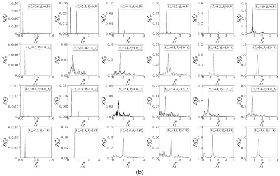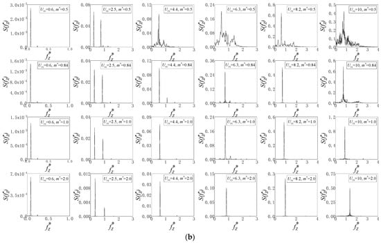Comparison of the spectra of in-line and cross-flow displacements for SFT with various natural frequency ratios (m* = 0.84): (a) in-line spectra; (b) cross-flow spectra.
