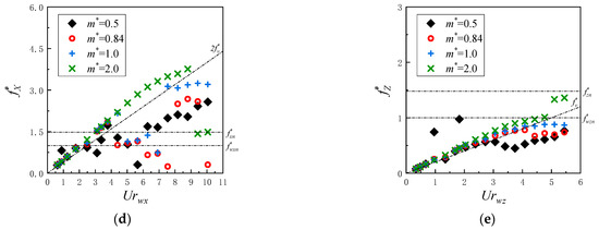 When the mass ratio decreases to a critical value (i.e., mcrit* = 0.54 ± 0.02 for a low mass-damping cylinder), the lower branch in the cross-flow direction disappears. This means that the vibration of the cylinder will have a large amplitude and be continuous with the increase in reduced velocity. Additionally, the vibration frequency may approach or even exceed the vortex shedding frequency [16,19].