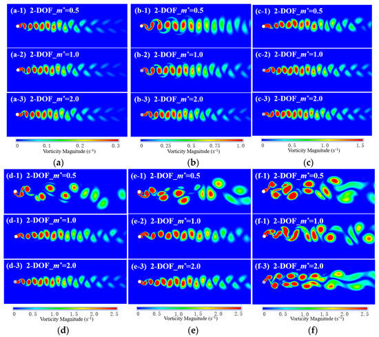 Figure 12 shows the comparison of the transient vorticity magnitudes of the SFT at typical reduced velocities under various mass ratios. It shows that, for ≤ 4.4, the effect of mass ratio on vortex pattern and length is limited. With the increase in reduced velocity, the vortex pattern of the SFT with a lower mass ratio becomes unstable, corresponding to the irregular XZ-trajectories. Due to the multi-frequency vibration and early frequency locking, vortex mode switching may occur during the vibration.