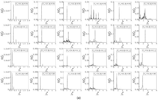 Figure 13 shows the comparison of the XZ-trajectories of the SFT under various natural frequency ratios at typical reduced velocities. Figure 14 shows the spectra of in-line and cross-flow displacements under the same conditions. Comparisons show that the two-degree-of-freedom vibration amplitudes of the SFT vary significantly with the increase in natural frequency ratio at ≥ 2.5. The pattern of XZ-trajectories and the width of spectra also vary with the natural frequency ratio.