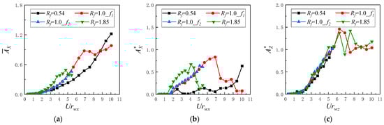 Figure 15 shows the non-dimensional response (i.e., amplitude, frequency) of the SFT versus reduced velocity under various natural frequency ratios. It shows that peak points of the two-degree-of-freedom vibration amplitudes exist with the increase in reduced velocity. The increase in the natural frequency ratio significantly affects the peak point and lock-in width of SFT vibration since the frequency-locking relationship varies. For Rf = 1.0 and = = , the maximum in-line vibration amplitude is 0.8D at = 6.9, and the maximum cross-flow amplitude is 1.4D. For Rf = 1.85, the maximum in-line vibration amplitude is 0.7D at = 4.1, and the maximum cross-flow amplitude is 1.4D. In addition, the in-line and cross-flow vibration frequencies of the SFT with various natural frequency ratios follow the Strouhal relationship at ≤ 3.4.