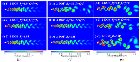 Figure 16 shows the comparison of the transient vorticity magnitudes of the SFT at typical reduced velocities under natural frequency ratios. It shows that, for ≥ 2.5, the effect of the natural frequency ratio on vortex pattern and length can be observed. With the increase in reduced velocity, the vortex pattern of the SFT with a larger natural frequency ratio becomes more unstable, corresponding to the irregular XZ-trajectories and various vortex modes.