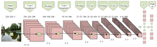 (1) The first convolution layer utilizes the Inception A structure instead, and its network structure parameters are shown in Table 1. As shown in Table 1, at 5 × 5, 3 × 3, and 1 × 1, three different convolution kernel scales were selected instead of using 11 × 11 convolution and multichannel feature extraction, while the pooling results of the input values were calculated, and then, the channels were fused in turn. In this way, the number of parameters and computations of the original 11 × 11 convolutional kernels can be reduced from 121 computational units to 46 computational units.