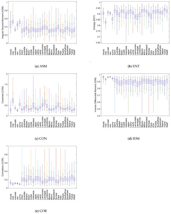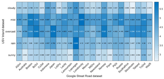 Figure 3 shows the boxplots of the textural features of the 29 scenes. Even though the distribution of each texture feature of the scenes within the USV Inland dataset has a large degree of discrete variability, the weights of different features need to be fully considered when performing the texture feature similarity matching operation. Based on these texture parameter values, the similarity between the USV Inland dataset and the Google Street Road dataset is calculated using the Mahalanobis distance, and the heatmap representation of the degree of similarity between the two datasets is shown in Figure 4.
