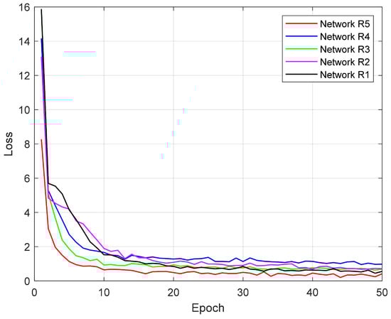 In this paper, to verify the effect of our network improvement, we designed a network specifically for the first two convolutional layers in the Inception V3 module to perform ablation experiments. The other conditions used were similar to those used for the design of five different networks: network R1, the classic AlexNet literature, network R2, and the original network based on the basis of the lightweight improvement; that is, the original five-layer convolution was simplified to a four-layer convolution and one pooling layer was added. Network R3, based on R2, incorporated the first convolutional layer into the Inception A structure. Network R4, based on R2, incorporated the second convolutional layer into the Inception C structure. Network R5, based on R2, incorporated both Inception A and Inception C structures. The recognition accuracies and loss values of these five networks are recorded in Figure 5 and Figure 6, respectively.