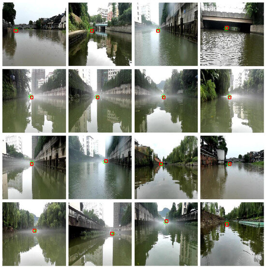 Moreover, we randomly selected 16 narrow waterway scenario images from the test set for testing, and the vanishing point detection results are shown in Figure 7. The green symbol in the figure indicates the location of the manually labeled vanishing points, and the red box is the detection result of our proposed network Model R5. The results, show that the detection results for all 16 pairs of images are consistent with the manually labeled results. In terms of the lightweight effect of the model, the average recognition time of our proposed R5 model is approximately 664 ms, which is affected by the fusion module, making it 11 ms more than the R2 model, but compared with the longest network Model R1, which takes 691 ms, the time consumed is reduced by 27 ms. Although our proposed R5 model increases the complexity compared with the lightweight model, its recognition effect is indeed improved.