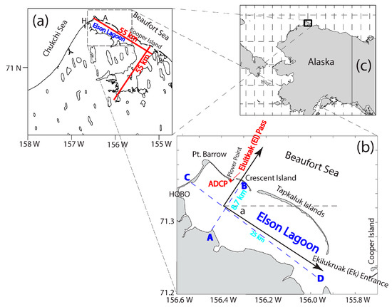 The study occurred in Elson Lagoon, located on the northernmost coast of the United States (Figure 1). Elson Lagoon is very shallow, with a mean depth of ~2–3 m. It encompasses two connected outer and inner lagoons with the shape of a flipped “L” (Figure 1a), and a length of ~55 km in both directions (Figure 1a). The outer lagoon is approximately rectangular, with a width of ~8.7 km (point A to point B), and a length of ~25 km (point C to point D, Figure 1b). The lagoon is located near the confluence of the Chukchi and Beaufort Seas at the northwestern-most corner of Alaska, roughly bounded within 156°36′ W, 155°54′ W, 71°12′ N, and 71°23′ N. This lagoon is oriented in the northwest-southeast direction, with an axis of ~−30° from the true west-east direction (Figure 1b). All the inlets are on the side of the Beaufort Sea, with the widest width being ~7 km between barrier islands. There is a relatively deep channel at the northwestern corner of the lagoon, Eluitkak Pass, that has a width of ~300 m and a maximum water depth of ~16 m [45]. A chain of islands located east and southeast of Eluitkak Pass acts as the seaward boundary of the lagoon connecting to the coastal ocean. These islands include the Crescent, Tapkaluk, and Cooper Islands. The inlet between Crescent and Tapkaluk Islands is about 700 m wide, while the inlet between Tapkaluk and Cooper Islands (the Ekilukruak Entrance) is 7.1 km wide. Tide in the region is semi-diurnal with very small amplitudes—the tidal range is ~0.2 m.