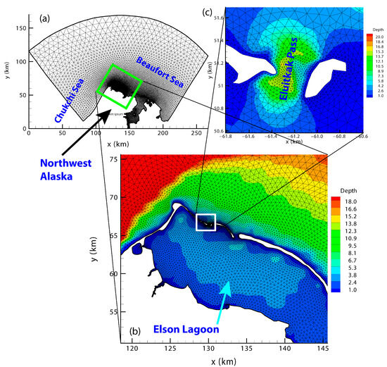 The unstructured grid FVCOM was used for a numerical simulation of wind-driven flows in Elson Lagoon. FVCOM [46] is suitable for simulating hydrodynamic processes in coastal and estuarine waters [11,26,47,48,49,50] as it has an advantage of satisfying volume conservation and a better resolution of complex coastlines with multiple inlets and variable bathymetry. This model was successfully used to simulate basin–coastal interaction processes in the Arctic Ocean, evident in [51,52,53,54,55]. The governing equations and numerical schemes of the FVCOM model are described in [46]. The bathymetric data used in the model were a combination of the dataset from the National Centers for Environmental Information (formerly National Geophysical Data Center) and our own measurements. The critical water depth data inside the lagoon and in the channel (the Eluitkak Pass) were obtained by the authors. The source of bathymetry data elsewhere in the model (basically the Beaufort Sea and Chukchi Sea) was from the HYbrid Coordinate Ocean Model (HYCOM; hycom.org) and NOAA’s ETOPO1 dataset (https://sos.noaa.gov/catalog/datasets/etopo1-topography-and-bathymetry/, accessed on 1 March 2024), a 1 arc-minute global relief model of Earth’s surface that integrates land topography and ocean bathymetry. The HYCOM datasets with water level and flow were interpolated onto our model grid for the initial condition and boundary condition of the model.