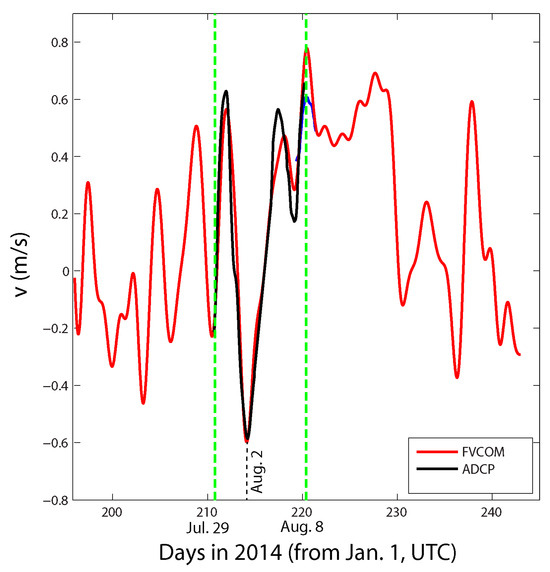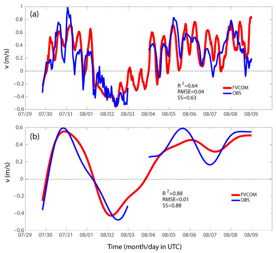 in which , , and N are the modeled velocity, observed velocity, and the total number of time series data points, respectively. The overall time series comparison yielded a skill score of 0.63 (Figure 4a). According to the definitions in previous studies [60,61,62], this skill score value corresponds to the “very good” category for the model performance. If only the subtidal signal was examined (i.e., after 40-h low-pass filtering), the skill score would increase to 0.88 (Figure 4b), which is in the “excellent” category. Note that there was a gap in the observations between the first and second deployments in 2014. The calculation of the skill score excluded this data gap.