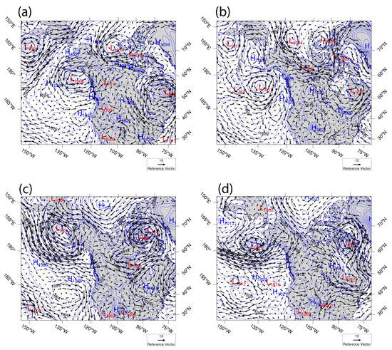 Weather maps (sea-level wind and air pressure contours) for (a) 30 July, (b) 2 August, (c) 8 August, and (d) 16 August, 2014, respectively.