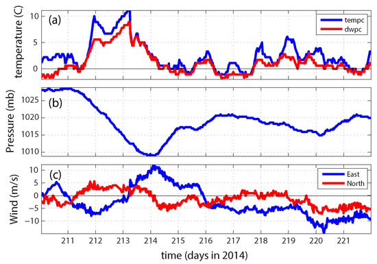 It can be seen from Figure 4a,b that most (71%) of the time during the deployment of the ADCP, the flow was from the lagoon to the ocean (positive flows). This finding is consistent with [45] for the observations in 2013 that reported that during 73–80% of the time the net flow was out of the lagoon from the western inlet (the Eluitkak Pass) over about three months. The asymmetric net flow was due to the wind effect associated with the weather systems including the arctic cyclones (low pressure systems) and the Beaufort High pressure system, which produces a persistent easterly wind in the study region. On 30 July (day 211), an arctic cyclone was over the western Canadian Archipelago, northeast of the study region, while a high-pressure system was over the study site (Figure 5a). These two weather systems led to an onshore wind that caused a counter-wind flow at Eluitkak Pass, confirming the findings in [45]. On 31 July or day 212, the high-pressure system was just north of the study site, at which the wind was from the east-southeast. It was a transient period during which the outward flow was diminishing as another low-pressure system moved into the region. The air pressure dropped to a minimum of 1009 mb at the beginning of Day 114 or 2 August (Figure 6b) when the wind became westerly and reached its maximum of ~12 m/s (Figure 6c).