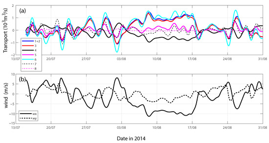 Results from the numerical model simulation. (a) Transport time series for Transects 1 through 8. Note that the transport through Transects 1 and 2 are added together for a reason explained in the text. (b) Wind velocity components in the east (wx) and north (wy) directions, respectively.