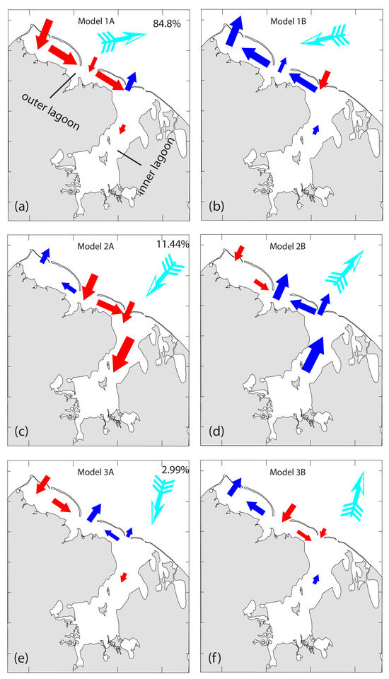 Tidally induced residual flows in estuaries can dominate the circulation under normal weather conditions [26], but they are usually weaker than the wind-driven flows in a multiple-inlet system, particularly when there is a strong weather system such as an atmospheric cold front [27]. The main reason is that tide is oscillatory, and thus the mean is much reduced; while in a multiple-inlet system, the wind-driven flow can produce through-flows so that with a given wind condition some inlets tend to have an inward flow and others an outward flow, especially under severe weather.