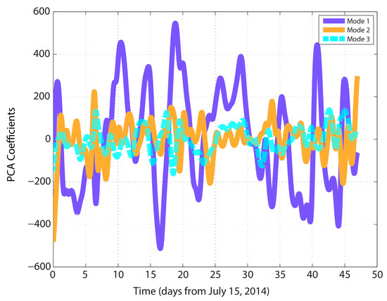 As in all EOF analysis, the coefficients for these empirical modes are functions of time (Figure 10), with magnitudes representing the importance of each at different times. The actual transport patterns are always a combination of these three modes, and therefore we rarely see the transport patterns described by only a single mode. We do see it, however, when one mode is dominant. For example, we can see episodes when the first mode’s coefficient has a magnitude much greater than those for Modes 2 and 3, during which time we can say that Mode 1 is much more important than the other modes.