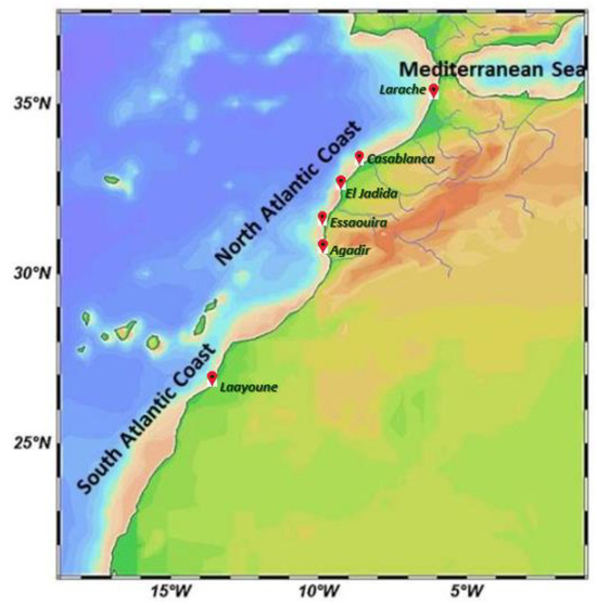 Map of the Moroccan coast indicating the locations of the six studied cities.
