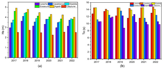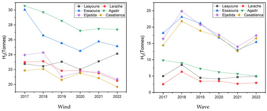 We present the results of our simulation of climatic conditions in six distinct Moroccan cities, with the aim of producing compressed hydrogen using offshore turbines and Oscillating Water Column (OWC) turbines. These results are updated every hour over a period of six years. The data collection process for our study was meticulously planned to establish a solid foundation for the analysis of crucial parameters, especially the significant wave height, as illustrated in Figure 3, and the total wind speed, also depicted in Figure 4. These parameters play a crucial role in assessing the wind and wave energy potential of the selected regions. Our data collection approach was methodical and relied on reputable sources, including Puertos del Estado, known for its reliability and accuracy in providing precise monthly data on wind speed, significant wave height, and wave period. This comprehensive approach spanned a complete six-year period, allowing us to thoroughly examine seasonal variations and long-term trends in wind speed, significant wave height, and wave period. The results of this meticulous data collection and analysis ensure the reliability and significance of our conclusions. By consolidating information from reliable sources and extending the analysis over a longer timeframe, our research is fortified with a robust and comprehensive dataset. This approach facilitates a thorough evaluation of the offshore potential and the Ocean Wave Climate (OWC) in the designated regions. As shown in Figure 3, which illustrates the wave in six coastal cities, distinct variations in the wave regimes become evident. Wave datasets provide valuable insights into swell conditions in diverse locations. Analysis of significant wave heights in different Moroccan cities between 2017 and 2022 reveal distinct coastal features for each area. In Larache, annual variations ranged from 2.97 m in 2021 to 3.63 m in 2018, implying relatively moderate conditions. Casablanca showed more significant fluctuations, reaching a peak of 4.11 m in 2018 and a trough of 3.47 m in 2017, highlighting significant coastal dynamics. El Jadida showed varying wave heights, from 3.55 m in 2021 to 4.42 m in 2018, revealing a diversity of oceanic intensity. Essaouira, with wave heights ranging from 3.81 m in 2020 to 4.61 m in 2017, showed significant coastal dynamics, requiring constant adaptation. Agadir stood out as having some of the highest heights, ranging from 4.01 m in 2022 to 4.91 m in 2017, underlining the fact that ocean conditions are often rougher. Finally, Laayoune, with moderate fluctuations from 2.25 m in 2020 to 2.73 m in 2018, reflected fewer pronounced coastal dynamics.