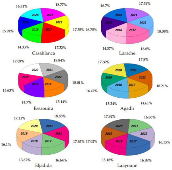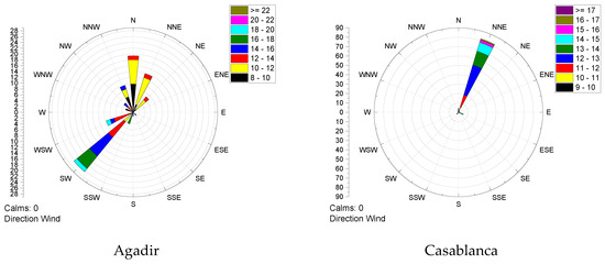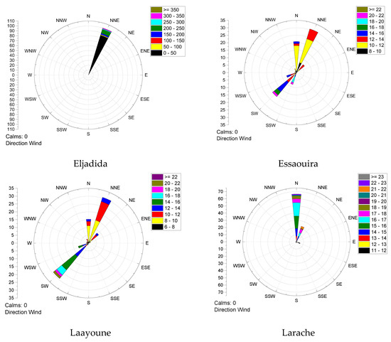 This analysis offered vital insights for coastal planning, maritime safety, and the understanding of ocean trends in each Moroccan city. In-depth analysis, particularly through a wave rose, improves our understanding of dynamic variations in wave climate, offering crucial information for safety and maritime planning. Moving to Figure 4, which illustrates wind roses for six coastal cities, a clear distinction in the wind regimes is evident. These data, presented as wind roses, offer a comprehensive understanding of the local wind climate, crucial for informed decision-making in sectors ranging from renewable energy to infrastructure development and environmental studies. The temporal variability of wind speed further contributes to a nuanced understanding of the intricate dynamics of the local wind climate. For instance, in Agadir, average wind speeds ranged from 11.93 m/s to 22.34 m/s, with directions covering a broad spectrum from N to W. Analysis, particularly through wind roses, revealed dominant directions and sectors with high average speeds, emphasizing the importance of directional analysis, particularly around N, NE, E, and W. In Casablanca, notable variations in speed (7.82 m/s to 20.41 m/s) and direction (N to W) were observed, with specific directions, such as NW, NNW, and WSW, exhibiting high speeds. The representation of temporal variability offers crucial information for wind planning. Similar fluctuations were observed in El Jadida, Essaouira, Laayoune, and Larache, with specific directions showing localized patterns of high speeds, highlighting their significance for energy planning.