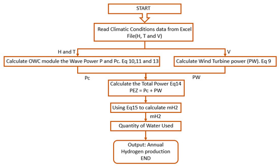 The system was modeled using MATLAB/Simulink, integrating real meteorological data adapted to Morocco’s climatic conditions, including parameters such as significant wave height, wave period, and wind speed. The power conditioning unit regulated the current required by the PEM electrolyzer to maintain optimal operating conditions. The model equations were solved at each time interval using the “Trust-region dogleg” solver in MATLAB/Simulink to solve the algebraic equations. To avoid algebraic loops, MATLAB’s “memory” block was utilized to estimate the PEM cell voltage from the first iteration. The variable initial values were defined in each subsystem using the MATLAB integration block, thereby breaking the algebraic loop. The solver processed the system of equations illustrated above according to the flowchart shown in Figure 5.
