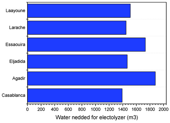 The efficiency of contemporary electrolyzers exhibited a range between 62% and 89%, contingent upon the applied electrical voltage and the operational parameters chosen by the manufacturer to optimize hydrogen output. These disparities stem from the diverse technological approaches employed and operational settings, with particular emphasis on water input conditions. For instance, industrial electrolyzers typically consume between 4 and 5 kWh of electricity along with approximately one liter of water per cubic normo-meter of hydrogen generated. In essence, the production of one kilogram of hydrogen necessitates an energy input ranging between 44 and 55 kWh, coupled with an intake of 11 L of water. Consequently, our proposed system demanded the water quantities outlined in Figure 6 across the six urban centers under scrutiny.