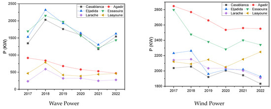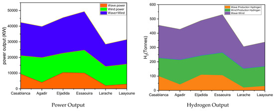 In summary, this research highlighted the potential of an innovative hybrid energy system combining wind energy and wave energy for hydrogen production through water electrolysis. This study specifically focused on six major Moroccan cities with significant potential in offshore renewable energies. The findings emphasize the importance of strategic planning and investments in renewable energy infrastructure, particularly in regions like Essaouira and El Jadida, where hydrogen production costs are comparatively low. The data illustrate the hydrogen production cost measured in euros per kilowatt (EUR/kW) in various cities of Morocco in 2022. Essaouira emerged as the city with the lowest hydrogen production cost at 16.78 EUR/kW, suggesting potentially favorable conditions for hydrogen-related initiatives in terms of economic viability. El Jadida and Casablanca closely followed, with respective costs of 17.85 EUR/kW and 18.78 EUR/kW, indicating similar levels of competitiveness in these regions. Agadir and Laâyoune had slightly higher costs compared to the previously mentioned cities, with values of 21 EUR/kW and 23.41 EUR/kW, respectively. In contrast, Larache appeared to have the highest hydrogen production cost among the listed cities, standing at 29.04 EUR/kW. This analysis also provided significant insights into the combined production of wind energy and wave energy, along with associated hydrogen generation, in the six studied Moroccan cities. Casablanca stands out for a harmonious balance between wave energy and wind energy, while Agadir is characterized by a strong dependence on wind energy. El Jadida, Essaouira, and Laâyoune also play crucial roles in sustainable hydrogen production. In conclusion, this study highlighted the potential of integrating renewable energies for hydrogen production in Morocco, while identifying challenges and opportunities in this field.