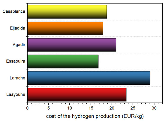 represents the installation cost of the hydrogen production facility, while MO denotes the total maintenance and operational cost, equivalent to 5% of the total. Therefore, the installation cost for this green hydrogen production facility is calculated to be 51.57 million euros using Equation (27). Furthermore, the calculation of the cost of hydrogen production per kilogram for a green hydrogen production facility planned for establishment in Morocco utilized data spanning from 2022 to 2050 [43]. Therefore, only the data from the year 2022 was used to ensure relevant and updated results for the context of this study. This computation was performed using Equation (28) [43], which is expressed as follows: