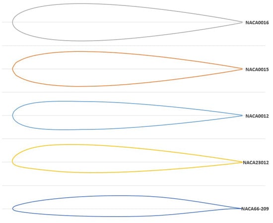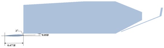 Five hydrofoils were evaluated for their suitability as the underwater tail wing structure of the amphibious vehicle: three symmetric hydrofoils (NACA0012, NACA0015, NACA0016) and two asymmetric hydrofoils (NACA23012 and NACA66-209). The profiles of each hydrofoil are depicted in Figure 2. Taking NACA0012 as a representative example, the installation specifics are illustrated in Figure 3. The tail hydrofoil’s rear end is positioned at a horizontal distance of 0.477B from the vehicle’s rear transom plate, and it is elevated 0.05B vertically from the underbody, angled at 2° relative to the incoming flow direction. The chord length for all selected hydrofoil profiles is consistent at 0.469B, and they share the same installation parameters.