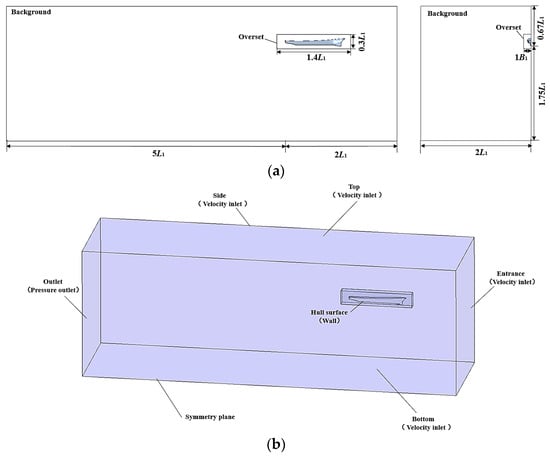 The computational domain comprises a stationary background and a dynamic overset domain. The background domain boundaries are set as follows: entrance boundary at 1 L1 from the bow, outlet boundary at 5 L1 from the stern, and top and bottom boundaries at 0.67 L1 and 1.75 L1 from the hull, respectively, and the side boundary at 2 L1 from the mid-longitudinal profile. Boundary conditions include a pressure outlet, a symmetry plane along the mid-longitudinal profile, velocity inlets for other boundaries, and a nonslip wall condition for the hull surface. Wave reflection is minimized by damping zones extending 1 L1 at the outlet, inlet, and side boundaries. The overset domain is a rectangular region with dimensions of 1.4 L1 in length, 2 B1 in width, and 0.3 L1 in height, as detailed in Figure 5.