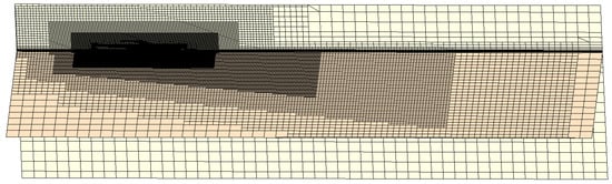 The flow governing equations are discretized using the finite volume method, with the Volume of the Fluid method employed to capture the free surface dynamics []. The Dynamic fluid–body interaction approach is utilized to simulate the motion of the vehicle body, allowing for the degrees of freedom in longitudinal rotation and vertical translation. To address the significant changes in vehicle attitude during navigation, the overset grid technique is applied. The selection of the time step, critical for the accuracy and stability of the simulation, follows the guidelines recommended by the International Towing Tank Conference for numerical simulation of ship resistance []. The equation for determining the time step, which involves the length between perpendiculars (LPP) of the boat body and the speed (U), is presented in Equation (3):