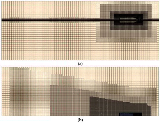 Grid division of the amphibious vehicle: (a) amphibious vehicle computational domain gridding; (b) free surface refining of amphibious vehicle.