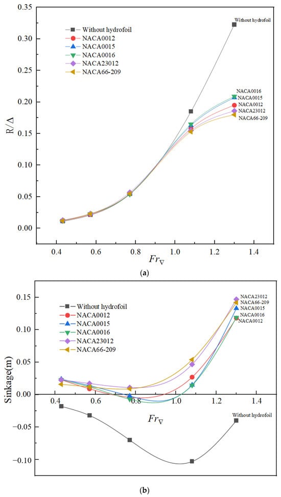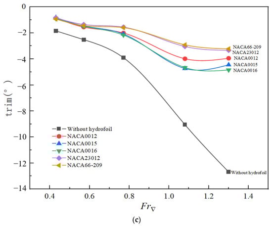 Fixing the bow plate angle and the center of gravity of the vehicle, a comparison of the CFDs numerical calculation results of the amphibious vehicle installed with different hydrofoils (NACA0012, NACA0015, NACA0016, NACA23012, and NACA66-209) as the underwater tail wings across a speed range of 0.43 < Fr∇ < 1.3 is shown in Figure 8.