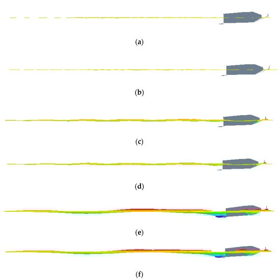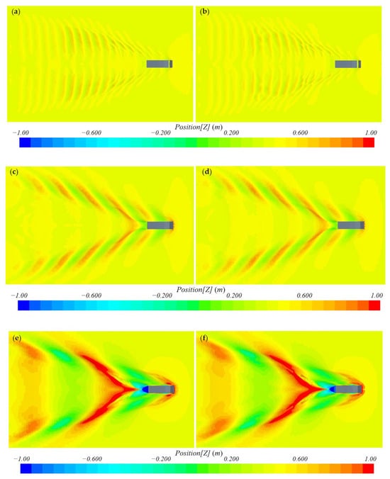 The vehicle water line of typical speed conditions: (a) NACA0012 Fr∇ = 0.43; (b) NACA66-209 Fr∇ = 0.43; (c) NACA0012 Fr∇ = 0.77; (d) NACA66-209 Fr∇ = 0.77; (e) NACA0012 Fr∇ = 1.3; (f) NACA66-209 Fr∇ = 1.3.