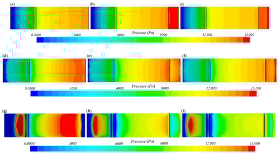 The underbody pressure distribution of typical speed conditions: (a) without hydrofoil Fr∇ = 0.43; (b) NACA0012 Fr∇ = 0.43; (c) NACA66-209 Fr∇ = 0.43; (d) without hydrofoil Fr∇ = 0.77; (e) NACA0012 Fr∇ = 0.77; (f) NACA66-209 Fr∇ = 0.77; (g) without hydrofoil Fr∇ = 1.3; (h) NACA0012 Fr∇ = 1.3; (i) NACA66-209 Fr∇ = 1.3.