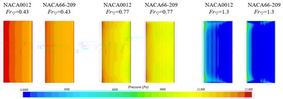 As can be seen from the results of different tail wings on amphibious vehicle’s resistance performance in Figure 8, the resistance trends of similar hydrofoils are close to each other, with NACA0012 in symmetric airfoils having a more obvious resistance reduction effect, and NACA66-209 in asymmetric hydrofoils being able to achieve a better resistance reduction effect in high-speed working conditions. Therefore, taking NACA0012 and NACA66-209 as examples to analyze the resistance reduction effect of the tail wing on amphibious vehicles can more clearly summarize the difference in resistance reduction performance between symmetric and asymmetric hydrofoils. In comparing amphibious vehicles equipped with asymmetric NACA66-209 and symmetric NACA0012 hydrofoils across speeds (Fr∇ = 0.43, Fr∇ = 0.77, and Fr∇ = 1.3), this study discerned the influence of hydrofoil geometry on the vehicle’s performance, particularly in terms of the hydrodynamics and flow fields shown in Figure 9 and Figure 10.
