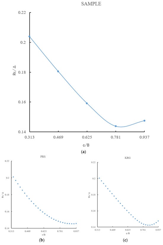 An agent-based model optimization method [] is utilized in this study to identify the optimal chord length (c) for the hydrofoil NACA66-209 equipped on an amphibious vehicle, aiming to achieve minimal sailing resistance at a Fr∇ of 1.3. This methodology integrates numerical simulations with agent models, setting c as the variable under investigation, with the vehicle’s resistance serving as the objective function. Resistance values for a range of c parameters are calculated through numerical simulations, creating a comprehensive dataset for optimization analysis. The process involves exploring this dataset to determine the c value that minimizes resistance, leveraging both numerical simulations and the construction of proxy models for accurate data representation. The selection of the optimal model is based on achieving the lowest possible error metrics, including the sum of squares error and the Prediction Error Sum of Squares (PRESS), which is expressed in Equation (6). Following the identification of the optimal chord length, further computational analysis is conducted to validate the optimization outcome.