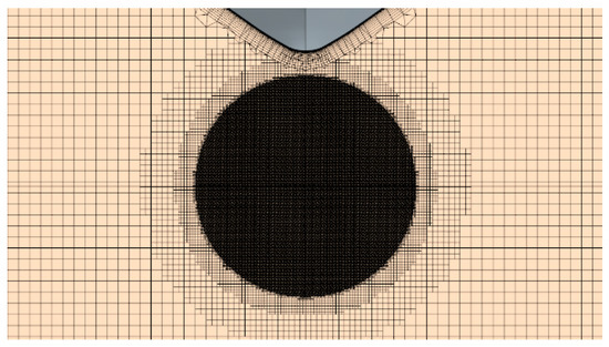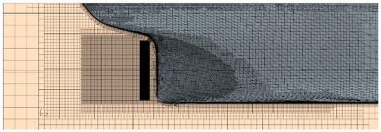 As depicted in Figure 2, the computational domain spans dimensions of 5.0 Lpp × 5.0 Lpp × 0.625 Lpp (both sides), with only the area below the draft considered in the CFD computations. In contrast, wind tunnel tests utilized a double-model setup. A medium grid arrangement, illustrated in Figure 3, shows the surface grid of a 3 m model of the Ryuko-maru. Figure 4 shows the volume grid of the center plane. Figure 5 shows the volume grid in the propeller plane. Dense grids are arranged to adapt to the complex flow around the stern. The first layer of grids on the hull surface was configured to achieve y+ ≈ 1. To ensure accuracy, three grid resolutions (coarse, medium, and fine) were generated for verification purposes, following the methodology employed by Matsuda et al. [3] the simulations were conducted under uniform flow conditions, as detailed in Table 2.