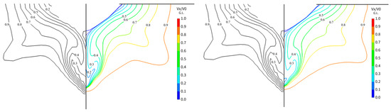 Comparison of contour line of Vx/V0 ((left): k-omega SST; (right): RSM-LPST).