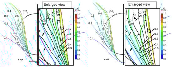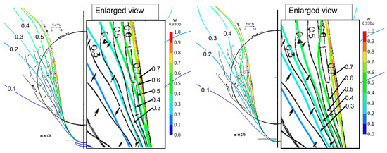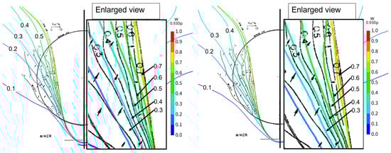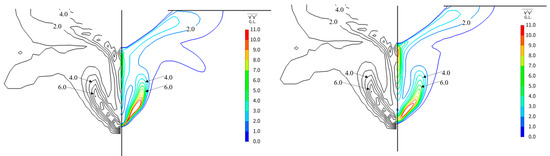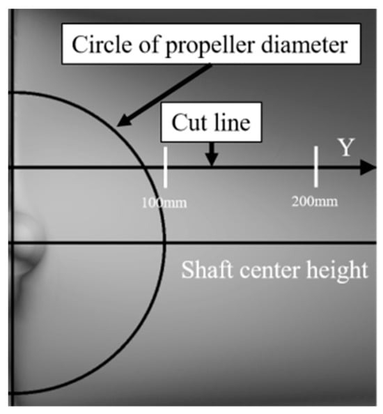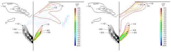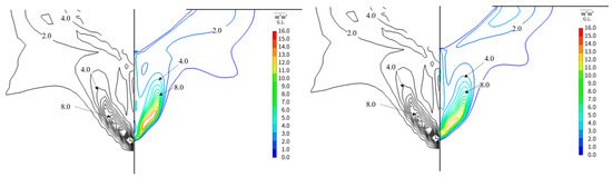 Figure 21, Figure 22 and Figure 23 compare the experimental results and the CFD-estimated wake distribution. Figure 21 displays the calculation results under smooth conditions, while Figure 22 shows the calculation results for = 150 (μm). Figure 23 depicts the results for = 0.153 × 10−3. Here, the Vx/V0 contour is juxtaposed with the results of the full-scale measurements (indicated by the black line).