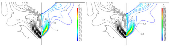 Comparison of contour line of k ((left): k-omega SST; (right): RSM-LPST).
